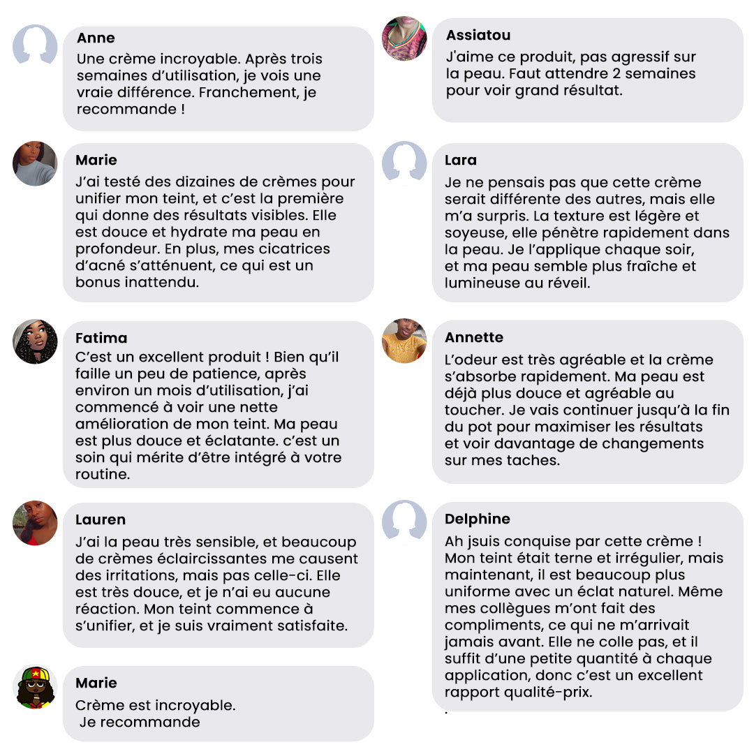 Avec sa formule innovante, notre crème combine des ingrédients actifs de haute qualité pour offrir des résultats visibles dès les premières applications. Dites adieu aux taches tenaces et aux irrégularités, et accueillez une peau visiblement plus lumineuse et uniforme.