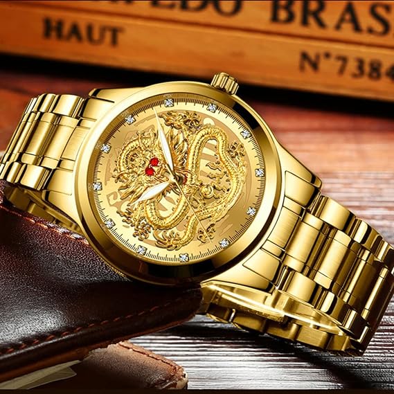 - Design Magnifique : Le cadran de la montre est orné d'un dragon en relief doré, symbole de bonne fortune, de prospérité et de protection. Chaque détail du dragon est finement travaillé pour capturer la majesté de cette créature mythique.