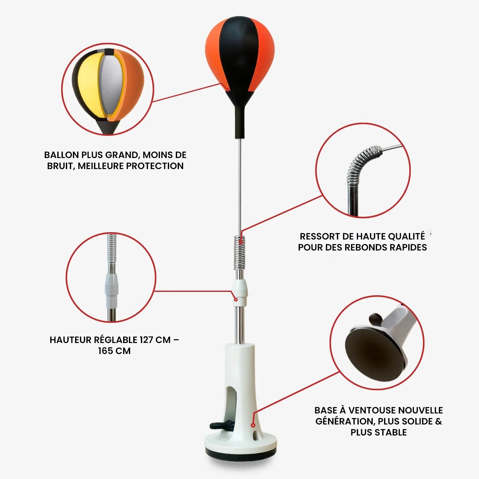 Grâce à sa ventouse renforcée, son ressort en acier haute tension, sa hauteur réglable (127 à 165 cm) et son ballon en cuir premium, il convient aussi bien aux adultes qu’aux enfants pour un entraînement sûr, amusant et efficace.