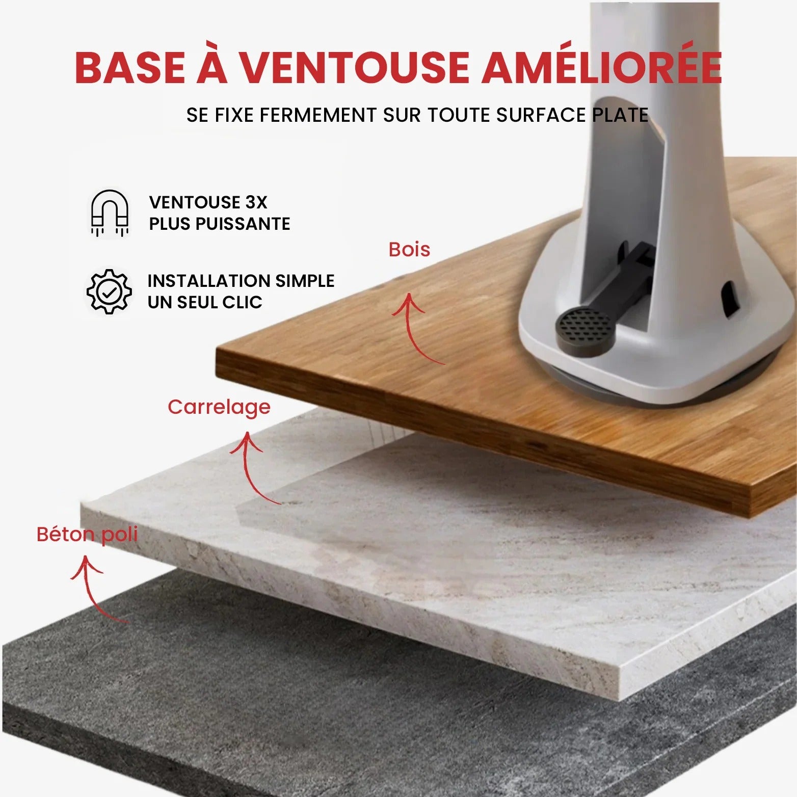 Se fixe solidement sur les sols plats, lisses et propres. Installation en un clic.
