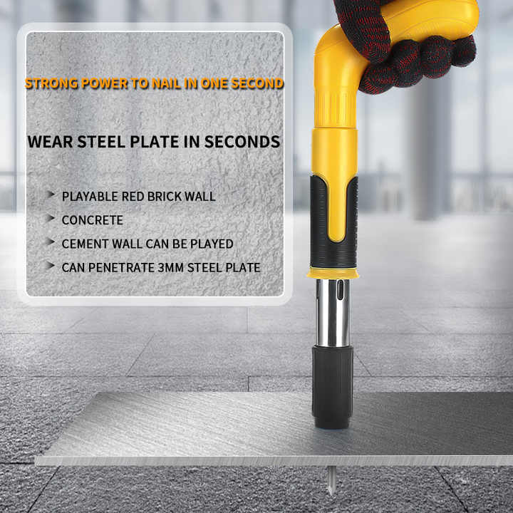 - Pistolet à clous avec clous en acier : Permet de fixer des clous en acier dans le béton, le bois et d'autres matériaux durs, offrant une solution rapide et efficace pour tous vos travaux de fixation.