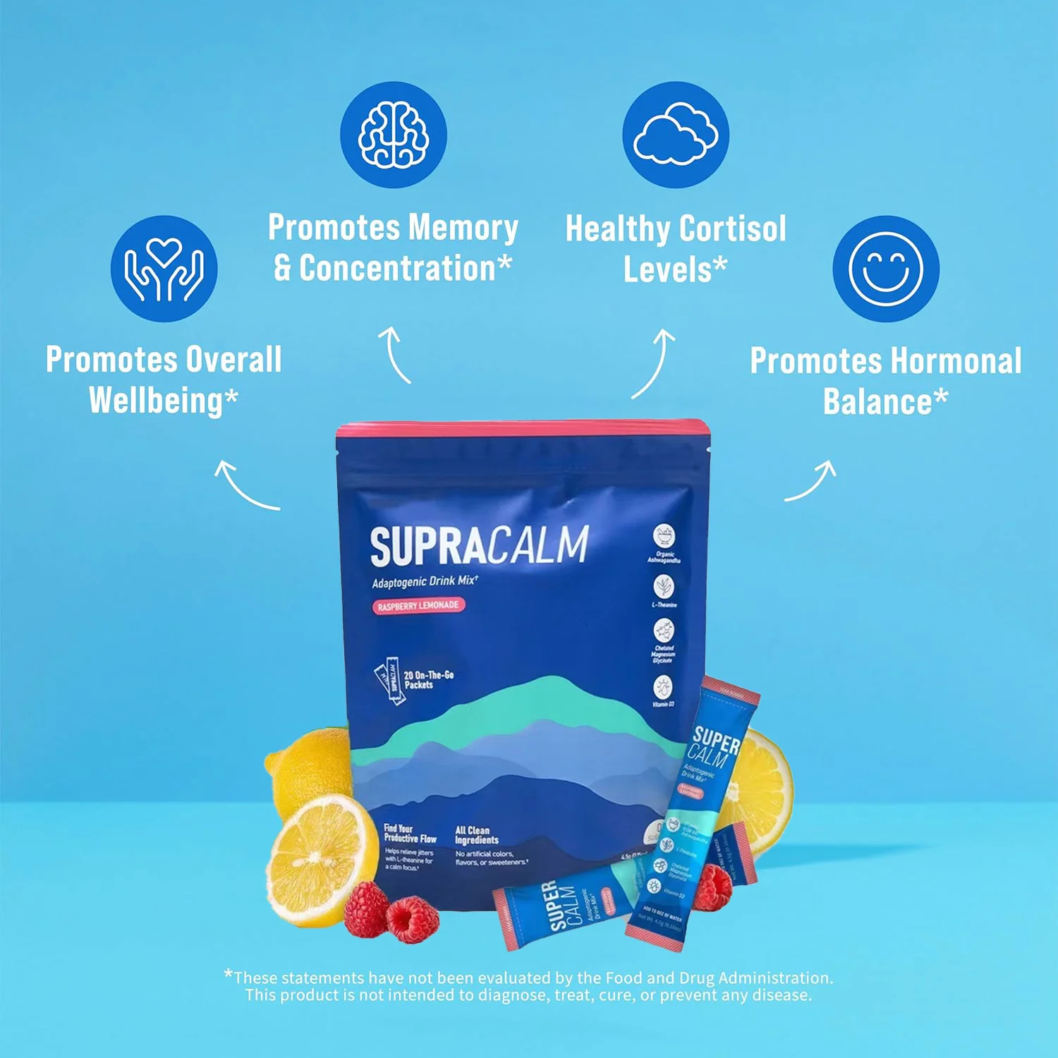 SupraCalm est une boisson adaptogène en stick, formulée pour favoriser un équilibre hormonal sain, réduire le stress et améliorer la concentration. Grâce à la combinaison de L-Théanine, Ashwagandha KSM-66, Magnésium Glycinate et Vitamine D3, SupraCalm soutient votre corps et votre esprit face aux déséquilibres quotidiens.